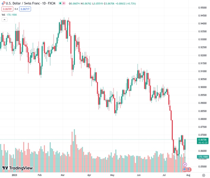 USDCHF currently trading at 0.8666 at the time of writing. Pair opened at 0.8608 and is trading with a change of 0.67 % .