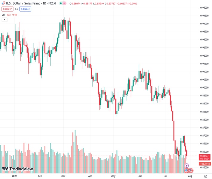 USDCHF currently trading at 0.8571 at the time of writing. Pair opened at 0.8608 and is trading with a change of -0.43 % .