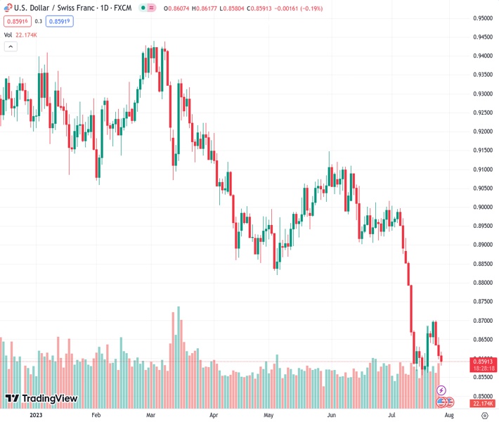 Following the FOMC meeting, the central bank raised interest rates by 25 basis points (bps) to a target range of 5.25%–5.5%, as expected. Federal Reserve (Fed) Chairman Jerome Powell stated that the FOMC will assess the totality of incoming data, along with its implications for economic activity and inflation. He added that it’s possible to raise the Fed funds rate again at the September meeting if the data warrants it. After the FOMC meeting and statement, the US dollar weakened broadly, which acted as a headwind for USD/CHF.