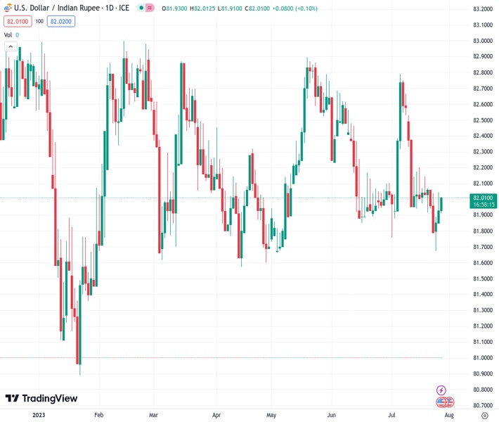 USDINR currently trading at 81.9935 at the time of writing. Pair opened at 82.0575 and is trading with a change of -0.08 % .