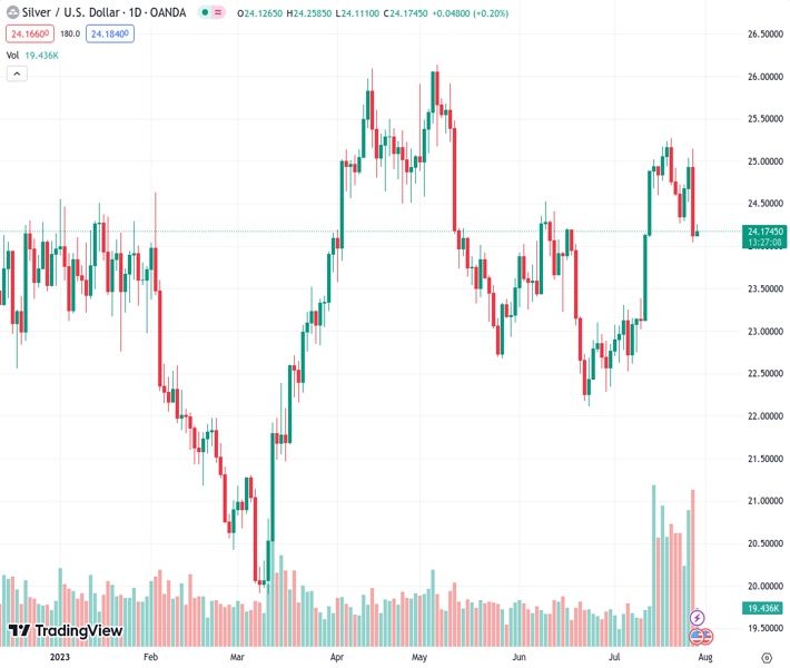 XAGUSD currently trading at 24.2 at the time of writing. Pair opened at 24.13 and is trading with a change of 0.29 % .