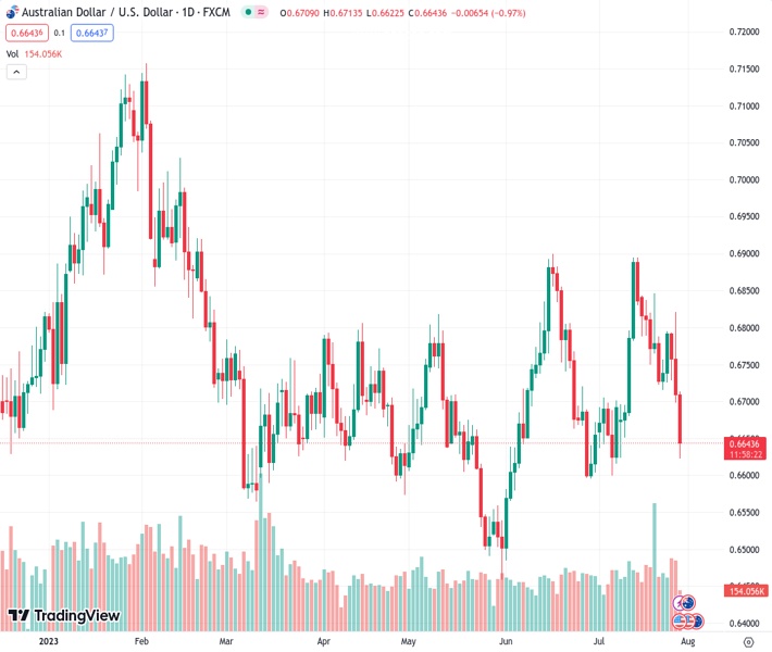 AUDUSD currently trading at 0.6642 at the time of writing. Pair opened at 0.6709 and is trading with a change of -1.0 % .