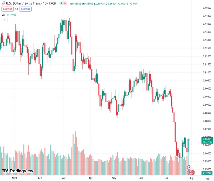 USDCHF currently trading at 0.8694 at the time of writing. Pair opened at 0.869 and is trading with a change of 0.05 % .