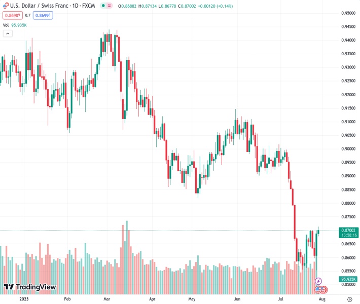 USDCHF currently trading at 0.87 at the time of writing. Pair opened at 0.869 and is trading with a change of 0.12% % .