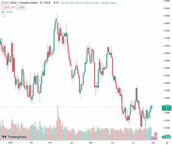USDCAD currently trading at 1.3235 at the time of writing. Pair opened at 1.3254 and is trading with a change of -0.14% % .