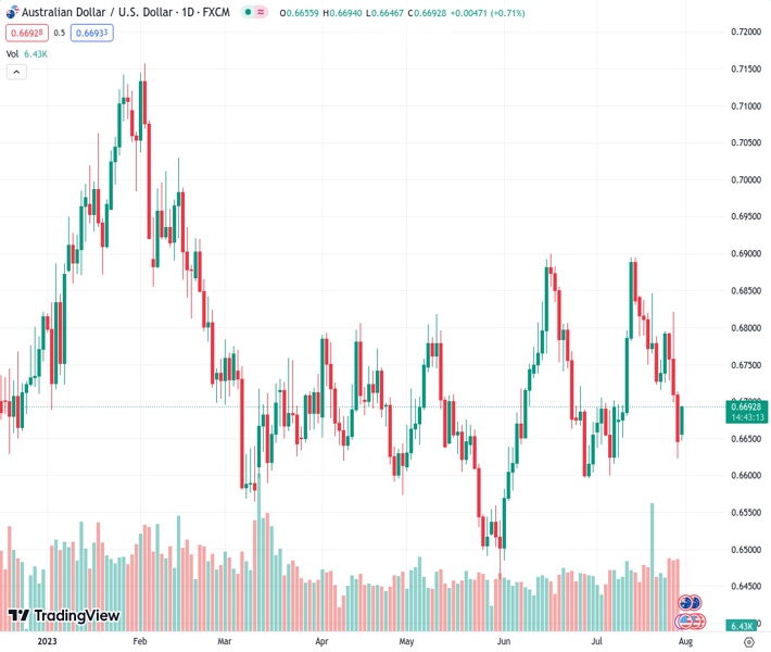 The AUDUSD currency pair, which was previously at 0.66887, has regained some lost value and is currently being exchanged at around 0.6680. This represents a 0.48% increase in value for the day.
