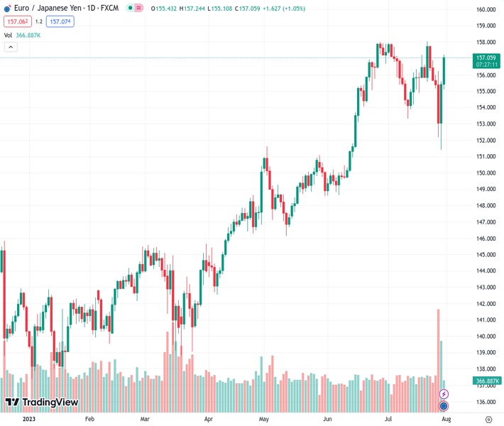 EURJPY currently trading at 157.01 at the time of writing. Pair opened at 155.51 and is trading with a change of 0.96 % .