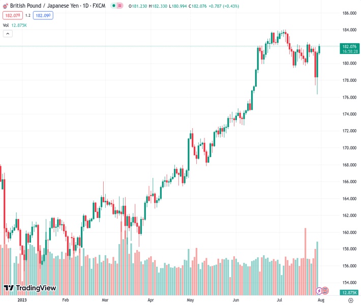 GBPJPY currently trading at 182.15 at the time of writing. Pair opened at 181.42 and is trading with a change of 0.4 % .