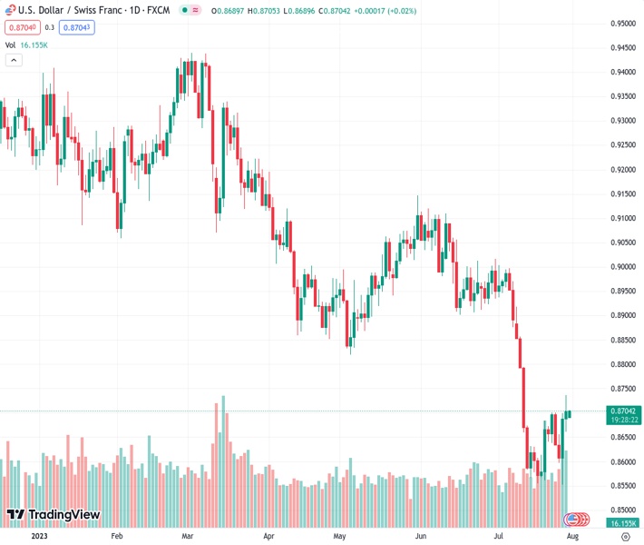 USDCHF currently trading at 0.87 at the time of writing. Pair opened at 0.8703 and is trading with a change of -0.03 % .