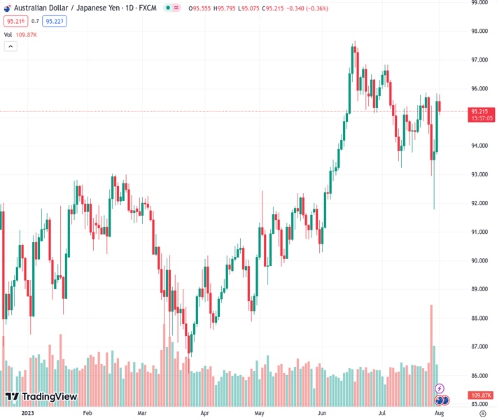 AUDJPY currently trading at 95.23 at the time of writing. Pair opened at 95.57 and is trading with a change of -0.36 % .