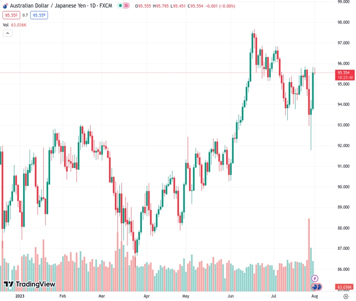 AUDJPY currently trading at 95.72 at the time of writing. Pair opened at 95.57 and is trading with a change of 0.16 % .