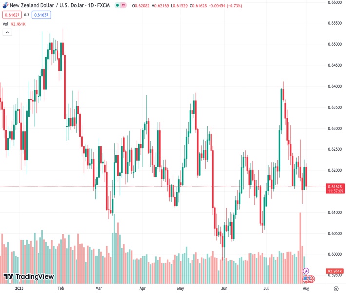 The NZDUSD pair, which is currently at 0.61607, encountered a new level of selling interest on Tuesday and is being influenced by multiple factors that are putting downward pressure on it.