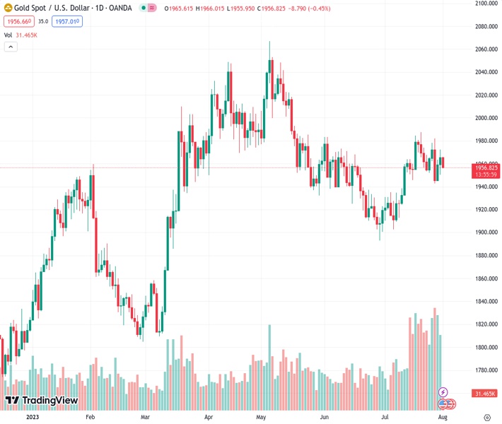 The price of gold, trading under the symbol XAUUSD, is currently trading defensively close to $1,955, which represents a 0.41% decrease for the day.