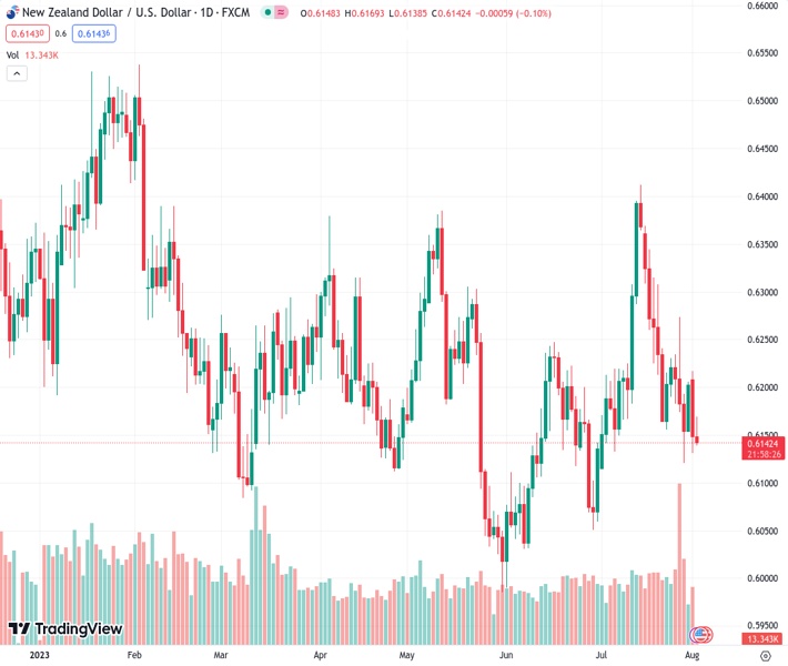 It’s worth noting that the US government’s rating cut by Fitch Ratings triggered the broad US Dollar pullback and allowed the Kiwi pair to post a corrective bounce to 0.6175.