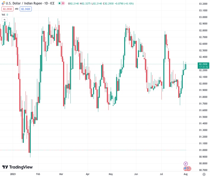 The USD to INR exchange rate is currently at 82.3175 and is showing an increase in strength around 82.28, marking a 0.02% gain for the day.