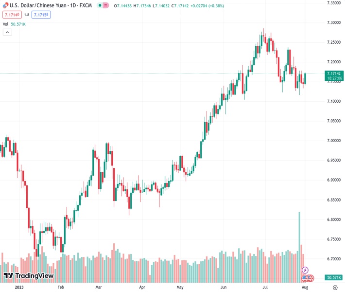 USDCNH currently trading at 7.1698 at the time of writing. Pair opened at 7.1464 and is trading with a change of 0.33% % .