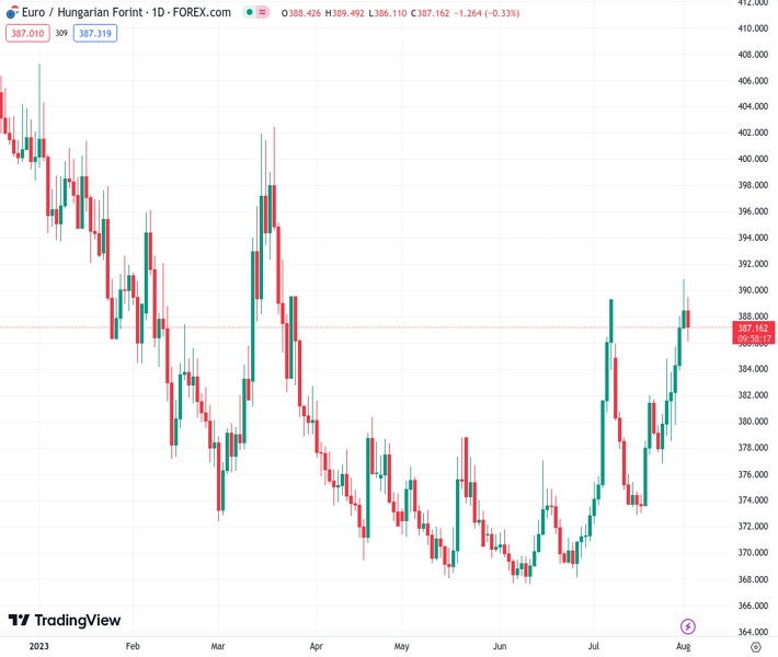 According to SocGen, the EURHUF pair may potentially retest its peak of 402.50 in March. The current rate is at 386.519.