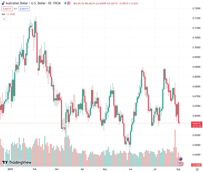 AUDUSD currently trading at 0.6616 at the time of writing. Pair opened at 0.6717 and is trading with a change of -1.50% % .