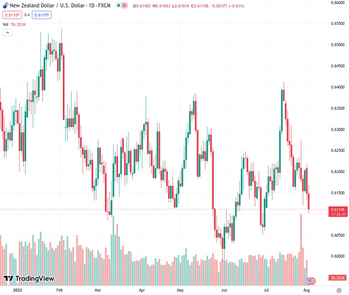 The currency pair NZDUSD, currently at 0.61097, continues its downward trend for the second consecutive day, reaching its lowest point in almost a month.