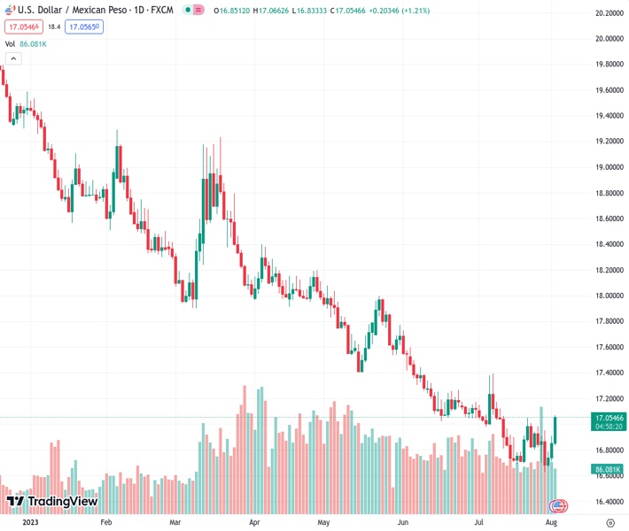 USDMXN currently trading at 17.0224 at the time of writing. Pair opened at 16.879 and is trading with a change of 0.85 % .