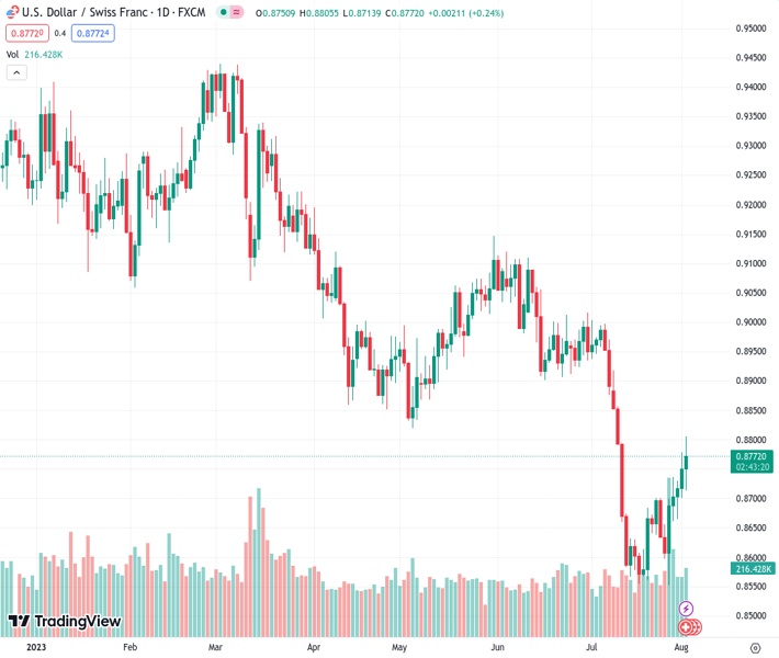 The USD/CHF has risen to its highest level since mid-July, towards 0.8800 and then settled near 0.8770, driven by a stronger USD. In simple terms, the US economy is holding firm, making investors place bets on a more aggressive bet on the Federal Reserve (Fed) which is benefiting the greenback.