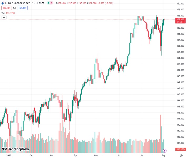 EURJPY currently trading at 157.37 at the time of writing. Pair opened at 157.46 and is trading with a change of -0.06% % .