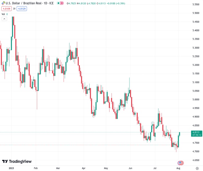 The exchange rate between the US dollar and Brazilian real, currently at 4.80700, is expected to remain favorable for the real in the near future, according to Commerzbank.