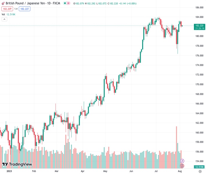 GBPJPY currently trading at 182.11 at the time of writing. Pair opened at 183.14 and is trading with a change of -0.56% % .