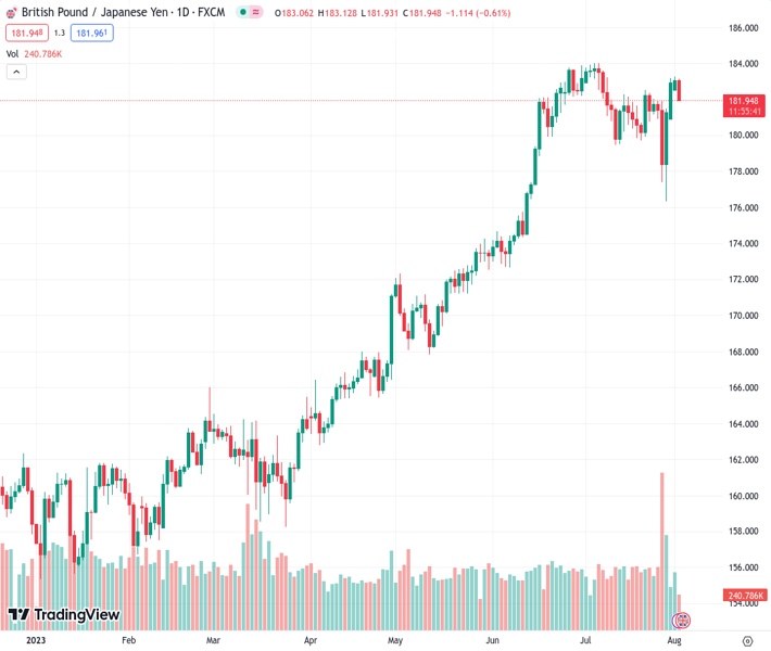 GBPJPY currently trading at 182.18 at the time of writing. Pair opened at 183.14 and is trading with a change of -0.52 % .