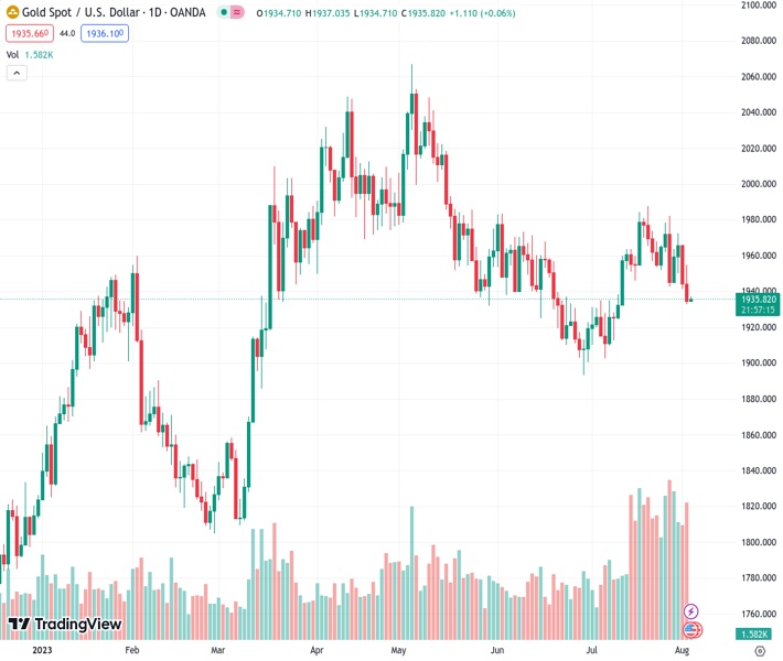 The gold price, currently at 1,935.67 for XAUUSD, is continuing to experience pressure as it hits a three-week low after breaking an important support level. The opinion of @nehcap is that there will likely be more decline to come.