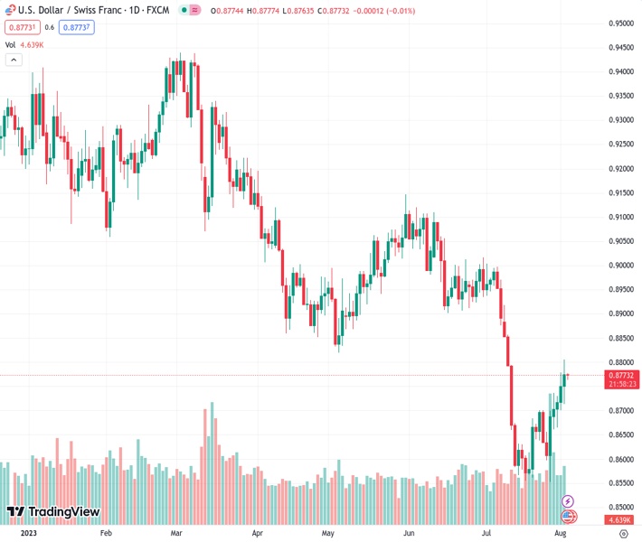 USDCHF currently trading at 0.8773 at the time of writing. Pair opened at 0.8753 and is trading with a change of 0.23 % .
