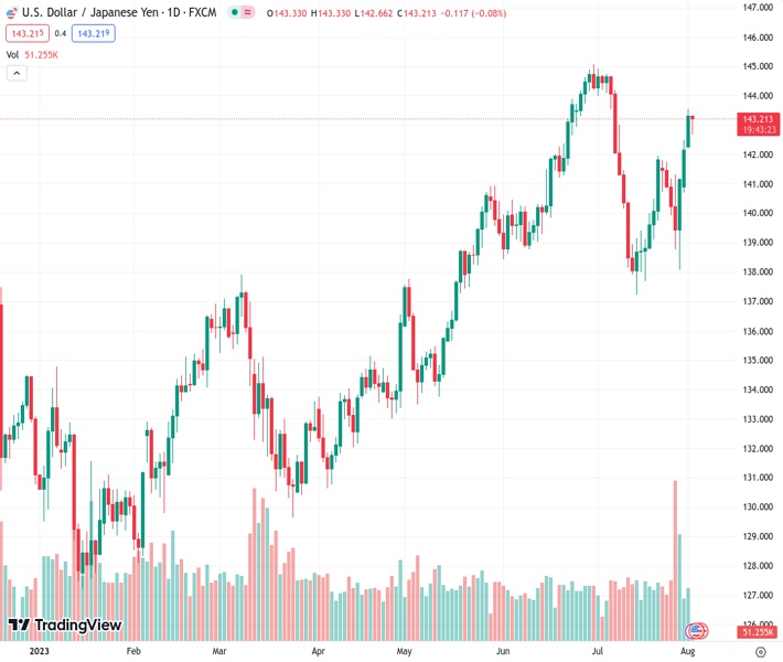 USDJPY currently trading at 143.09 at the time of writing. Pair opened at 143.33 and is trading with a change of -0.17 % .