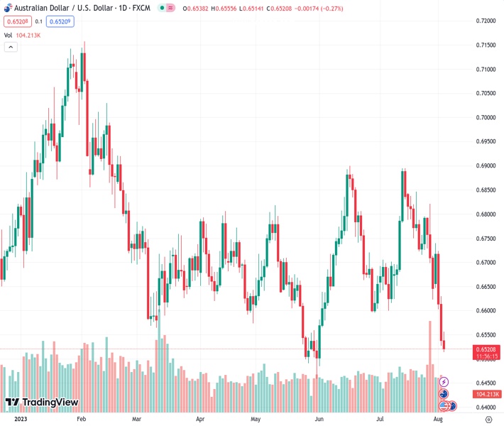 For the third consecutive day, the AUDUSD pair is falling, reaching its lowest point since early June.