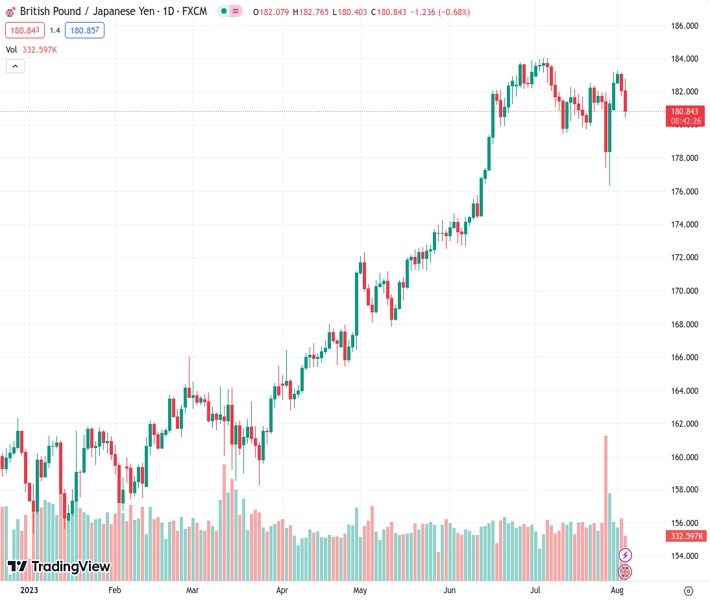 GBPJPY currently trading at 180.77 at the time of writing. Pair opened at 182.19 and is trading with a change of -0.78 % .
