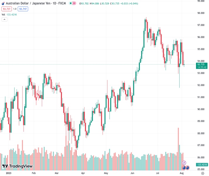 AUDJPY currently trading at 93.99 at the time of writing. Pair opened at 93.72 and is trading with a change of 0.29 % .
