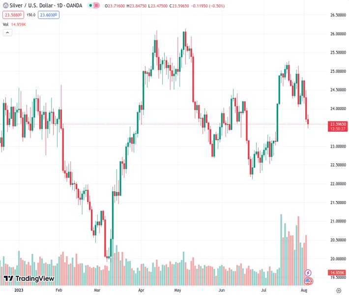 XAGUSD currently trading at 23.56 at the time of writing. Pair opened at 23.73 and is trading with a change of -0.72 % .