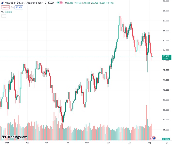 AUDJPY currently trading at 93.39 at the time of writing. Pair opened at 93.72 and is trading with a change of -0.35 % .