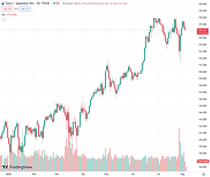 EURJPY currently trading at 156.06 at the time of writing. Pair opened at 156.77 and is trading with a change of -0.45 % .