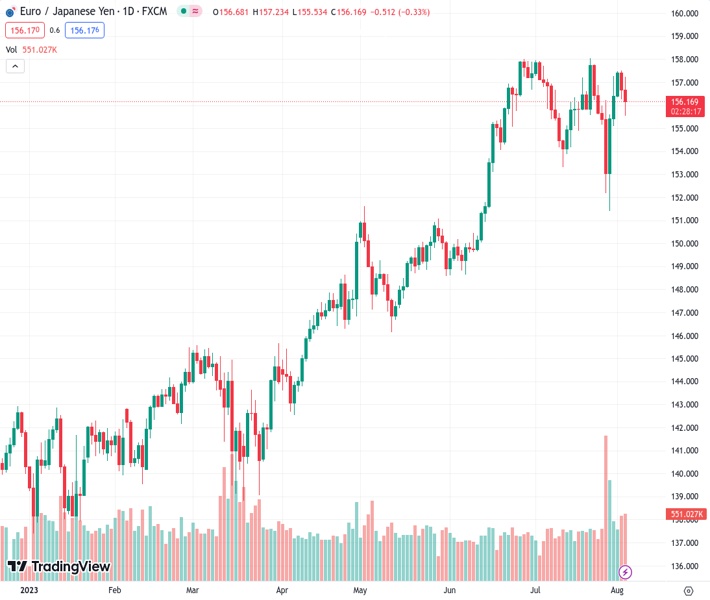 EURJPY currently trading at 156.16 at the time of writing. Pair opened at 156.77 and is trading with a change of -0.39 % .