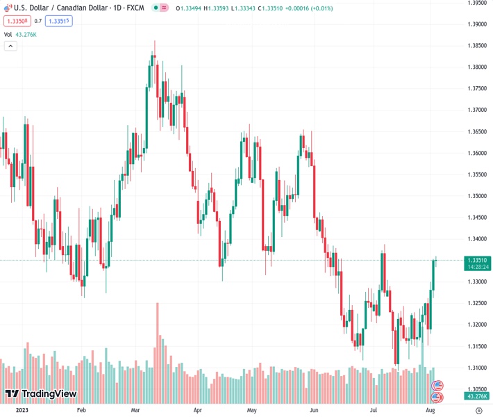 The USDCAD currency pair has reached a level of 1.33501, which is close to the highest point seen in July. This increase has occurred over the past two days, but there hasn’t been much movement recently.