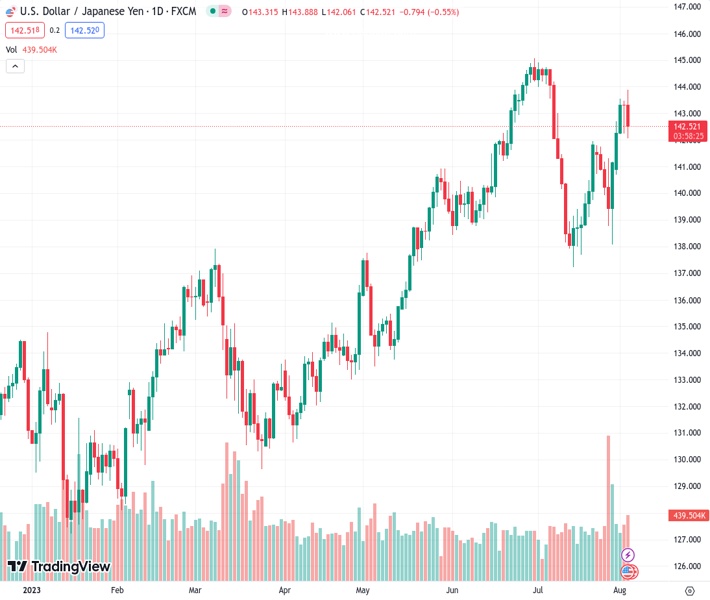 USDJPY currently trading at 142.44 at the time of writing. Pair opened at 143.33 and is trading with a change of -0.62 % .