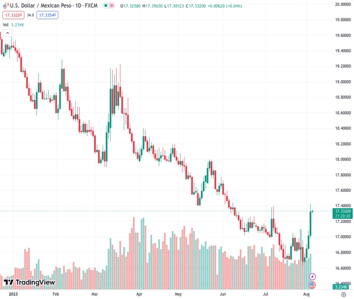 USDMXN currently trading at 17.327 at the time of writing. Pair opened at 17.024 and is trading with a change of 1.78% % .