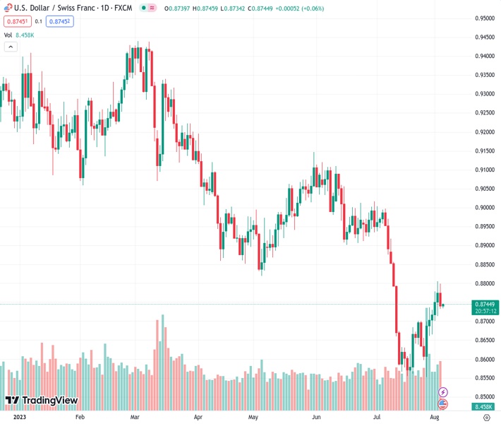 USDCHF currently trading at 0.8742 at the time of writing. Pair opened at 0.8775 and is trading with a change of -0.38 % .