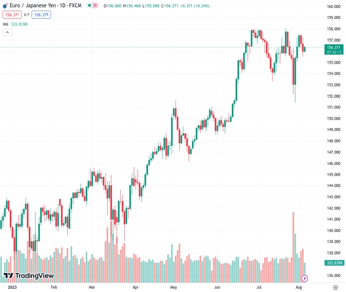 EURJPY currently trading at 156.32 at the time of writing. Pair opened at 156.07 and is trading with a change of 0.16 % .