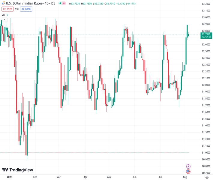 USDINR currently trading at 82.8015 at the time of writing. Pair opened at 82.8306 and is trading with a change of -0.04 % .