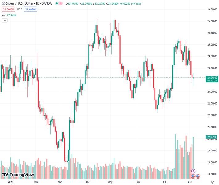 The XAGUSD pair, which represents the price of silver, experienced a slight rebound following the release of underwhelming US jobs data for July. It is now trading at $23.57, having bounced back from the 200-day exponential moving average (EMA) support level at $23.18.
