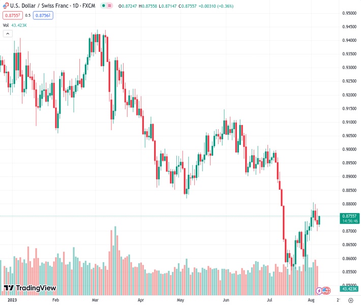 USDCHF currently trading at 0.8746 at the time of writing. Pair opened at 0.8727 and is trading with a change of 0.22% % .
