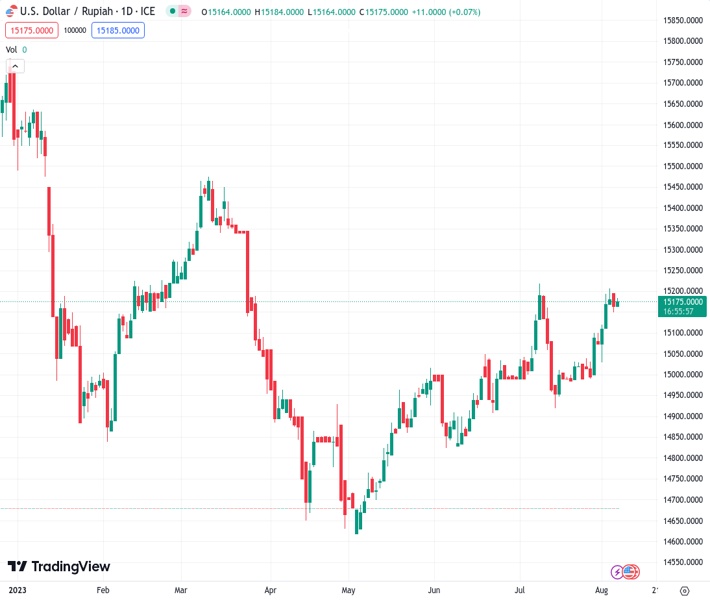 USDIDR currently trading at 15182 at the time of writing. Pair opened at 15152.9 and is trading with a change of 0.19% % .