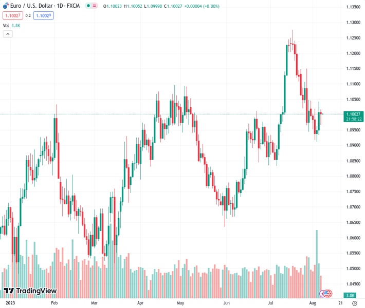 EURUSD currently trading at 1.1003 at the time of writing. Pair opened at 1.1009 and is trading with a change of -0.05% % .