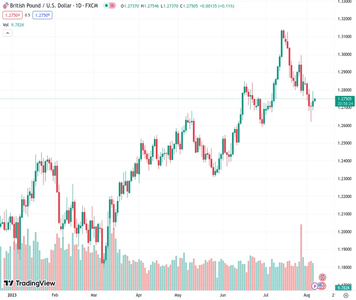 The GBPUSD pair at 1.27477 experienced a decline after a short-lived rebound last week without any sustained momentum.